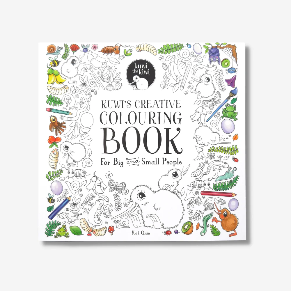 Following on from the hugely popular ‘Kuwi’s First Egg’ and ‘Kuwi’s Huhu Hunt’ books. Kuwi the Kiwi takes you on a native New Zealand journey, through intricate line art. The illustrative magic of Kat Quin, comes alive with this creative colouring book, stunningly illustrated for all ages. Certain pages are intentionally unfinished and encourage your creative side. A perfect project for adult and child to work on together (so you don’t have to hide your colouring books from the kids anymore!) Removable pages, so the end result can be treasured as a piece of art. For Big and Small People. DIMENSIONS: 250 mm x 240 mm PAGES: Perforated, easy tear pages 64 pages BIND: Matte Laminated Soft cover Stitch Perfect bound. ISBN: 9780473349745