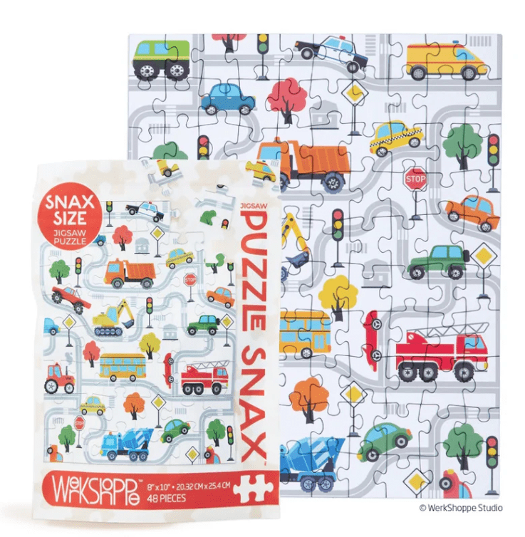 Keep little brains busy with a 48 piece Puzzle Snax jigsaw puzzle from WerkShoppe. Packaged in a resealable pouch, they are perfect for travel and taking to the bach.